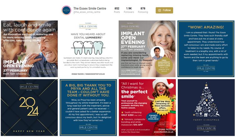 Add social proof: Showcasing positive reviews, testimonials, and user-generated content builds trust and credibility with potential customers. It acts as a social validation of your brand’s value. Here’s an example of this from our client, The Essex Smile Centre, a dental studio who have achieved excellent social growth over the last few years: