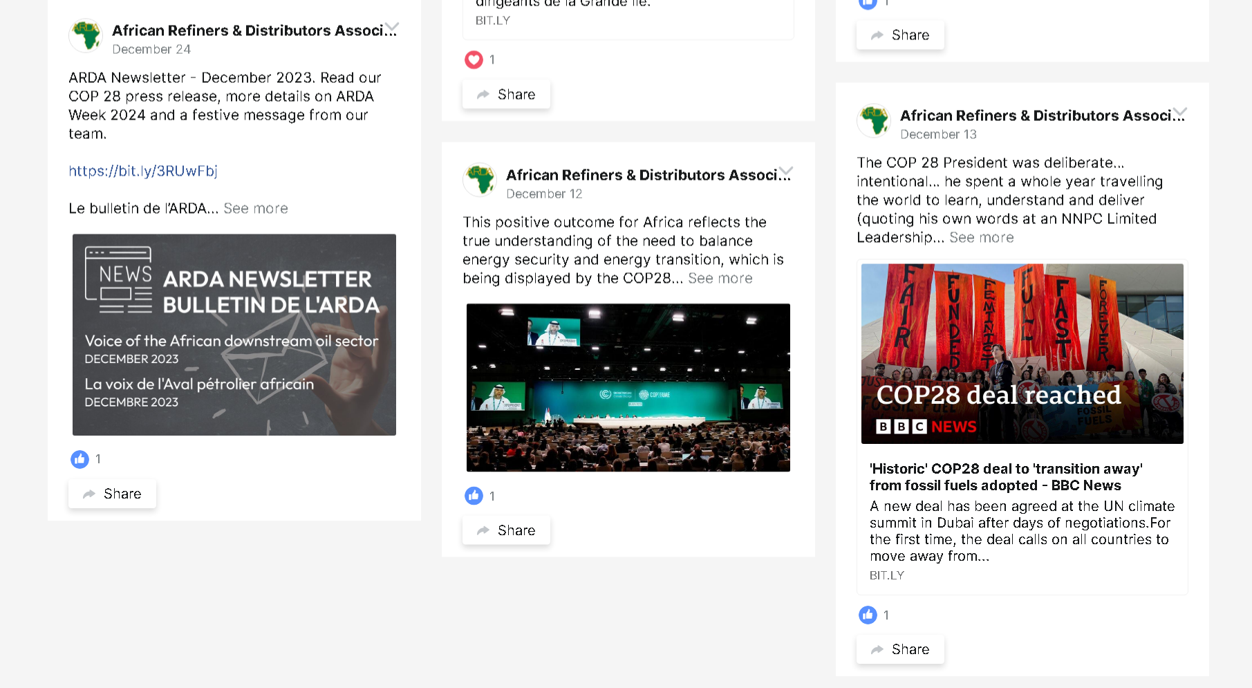 Add social media buttons: Make it easy for visitors to share content and follow you on social media by including prominent buttons alongside your content. Take a look at the feed below for our client, ARDA. We added ‘share’ buttons to each post as well as social links to the footer of their website.