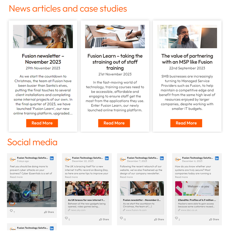 Keep your content fresh: Integrating social media feeds ensures your website always has new and engaging content, even if you’re not constantly updating it yourself. An integrated LinkedIn feed has benefited our client Fusion in this way, providing regular content to their news page in between the release of their monthly blog articles.