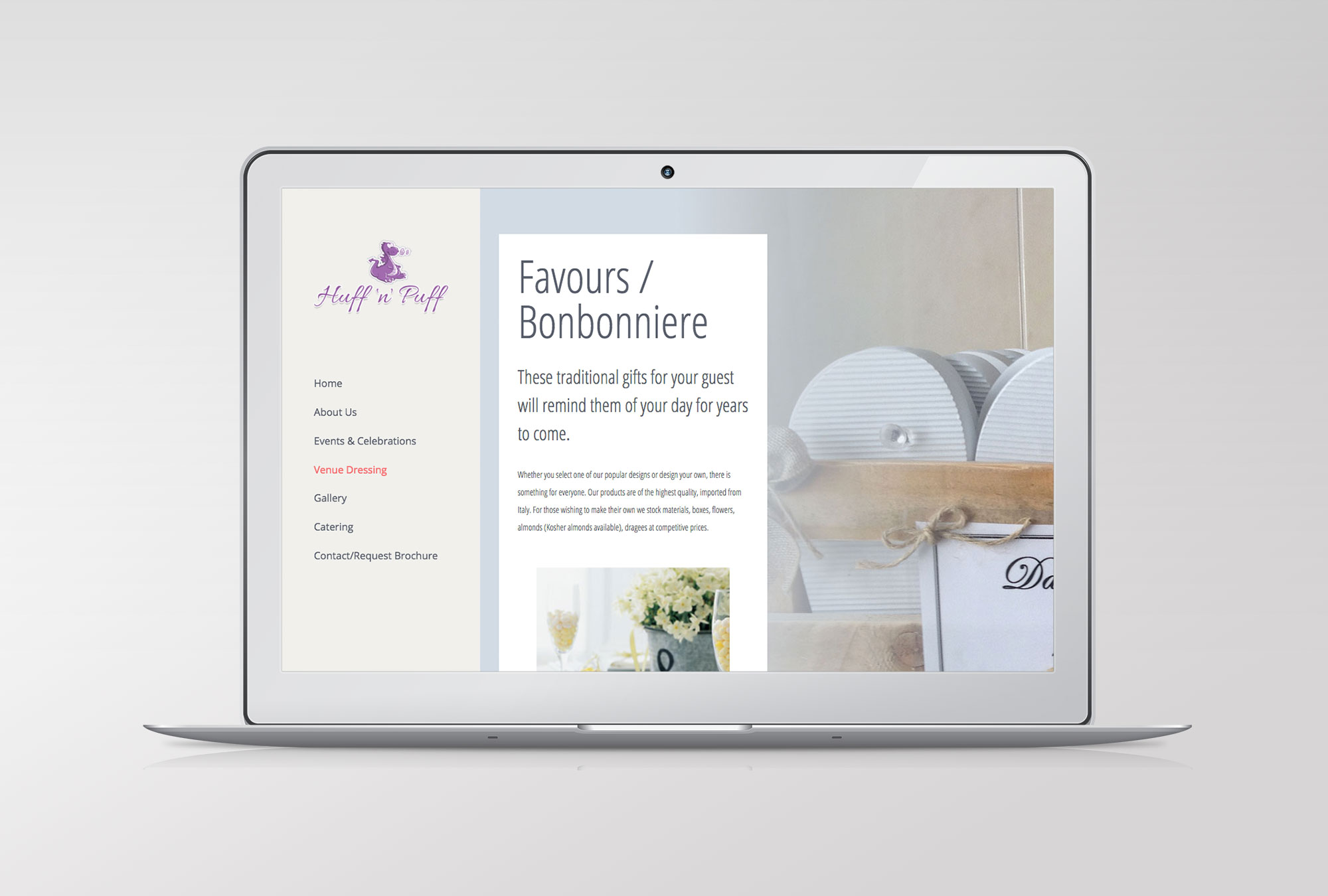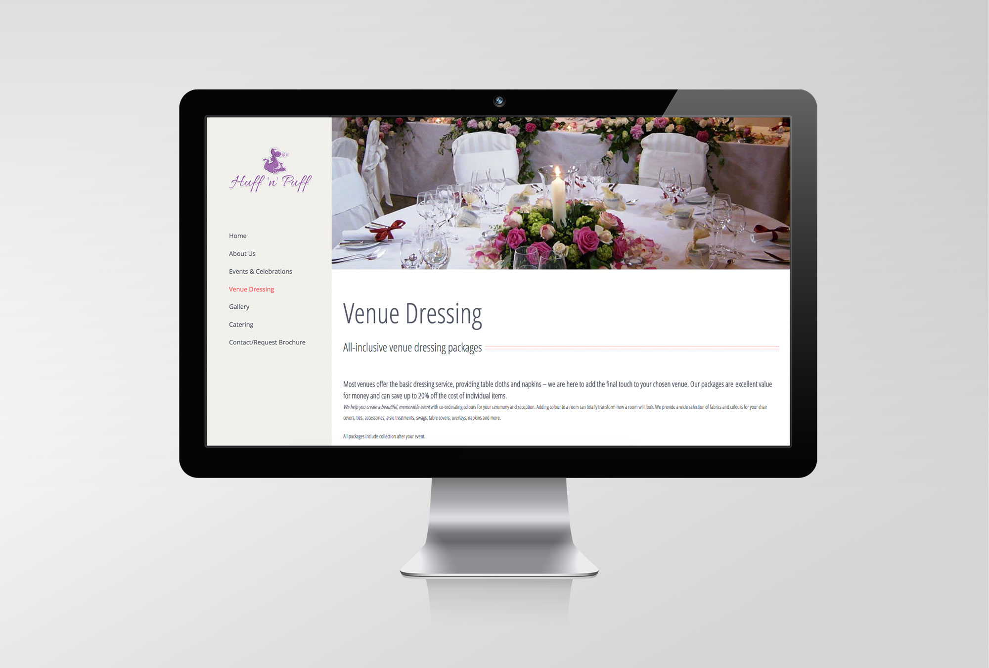 We were able to work with existing copy from the previous website and use new imagery for a refreshed look, so the site took only a few weeks to design. The new layout provides web browsers with the ability to search by  event (wedding, corporate, parties etc.) or service (balloons, chair covers, floral, catering etc).